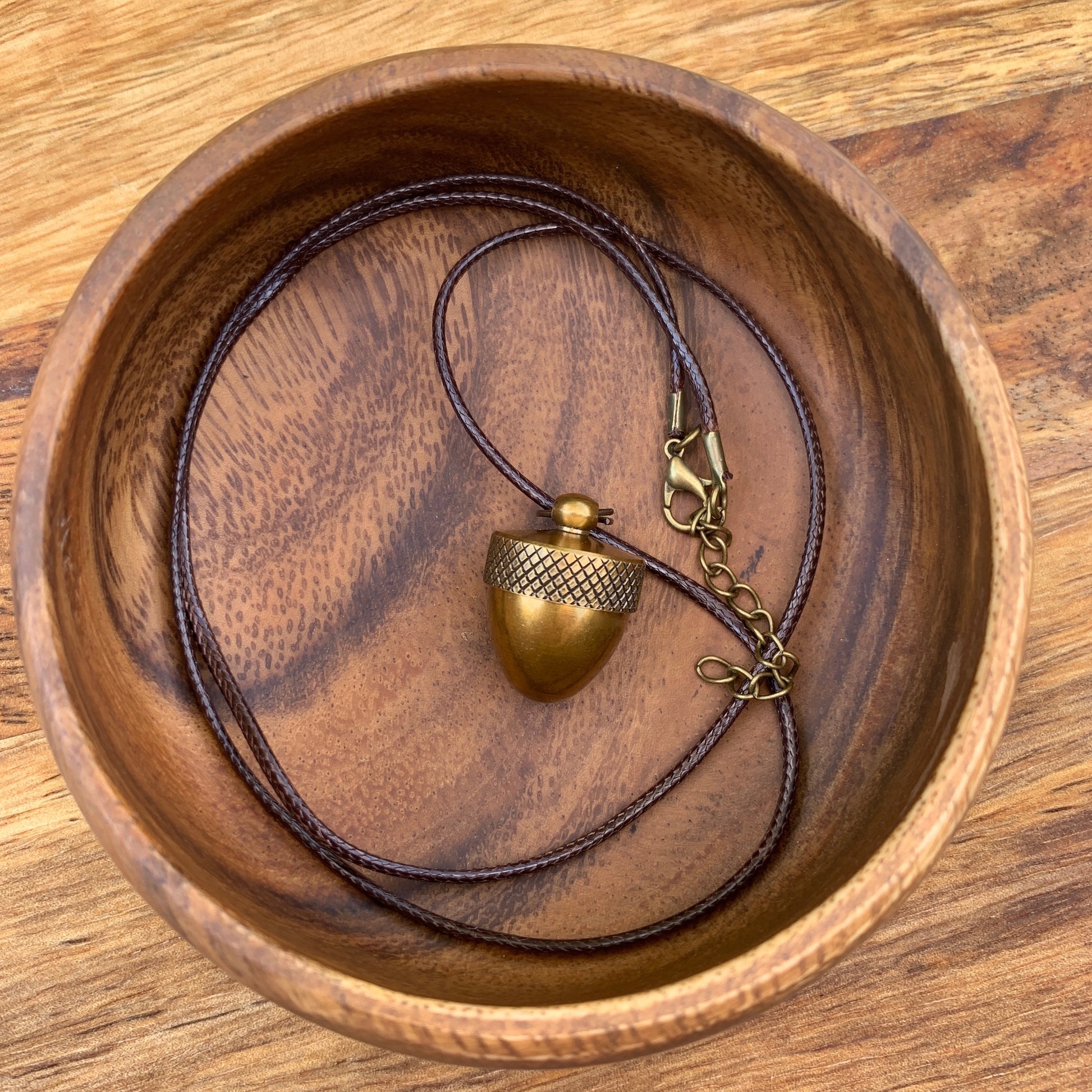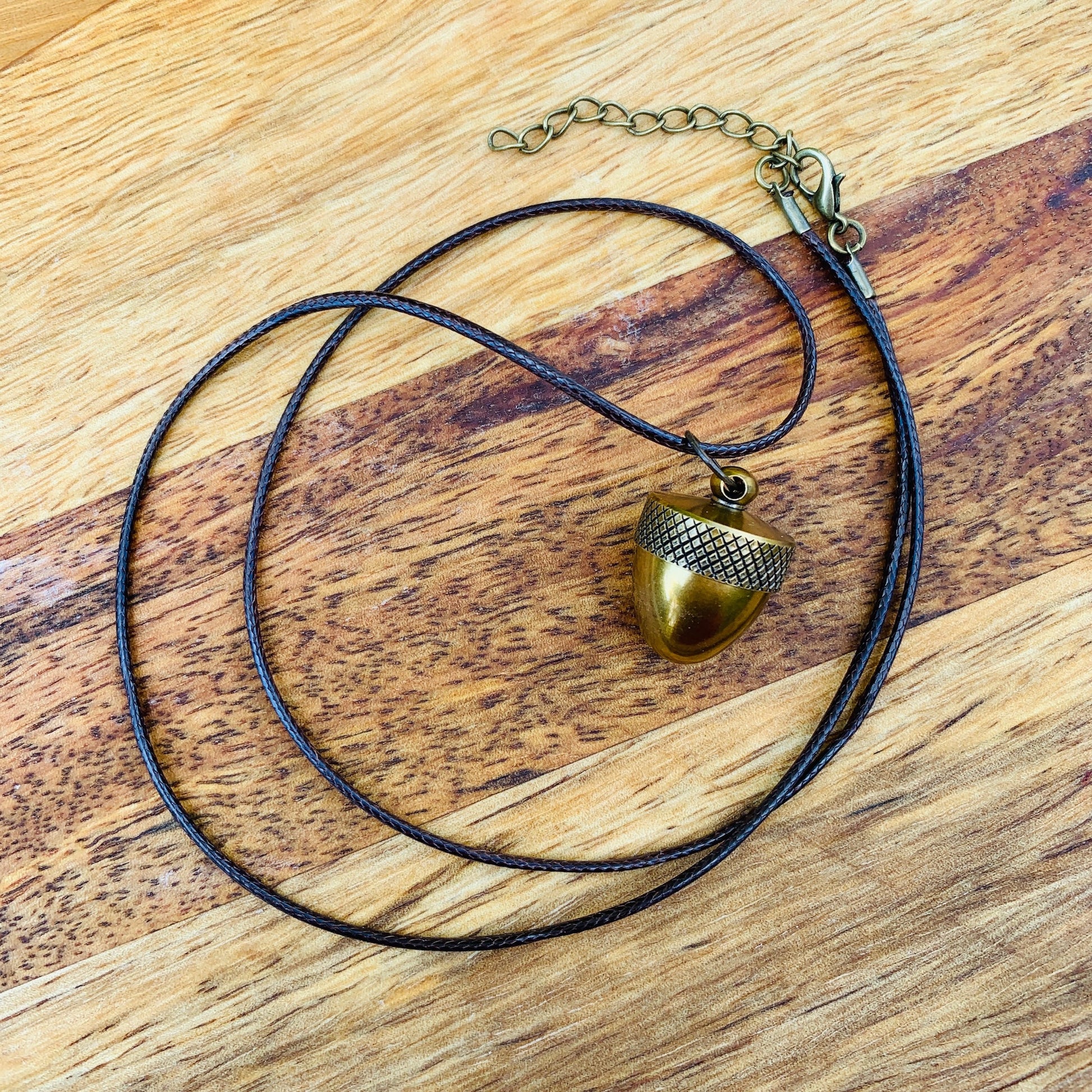 This bronze-tone acorn is about an inch long. It comes with a waxed cord necklace with a lobster-claw clasp. The cord measures about 23 inches, plus an additional 2 inches of extension links.