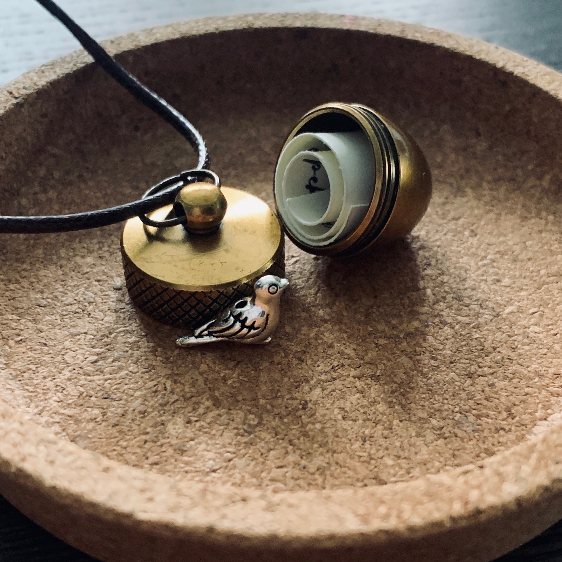 Curious Dreamers will discover that the acorn is actually a locket. The cap unscrews to reveal a hidden chamber. That compartment holds a secret which will add a little mystery and purpose to your explorations in Birdmoss.