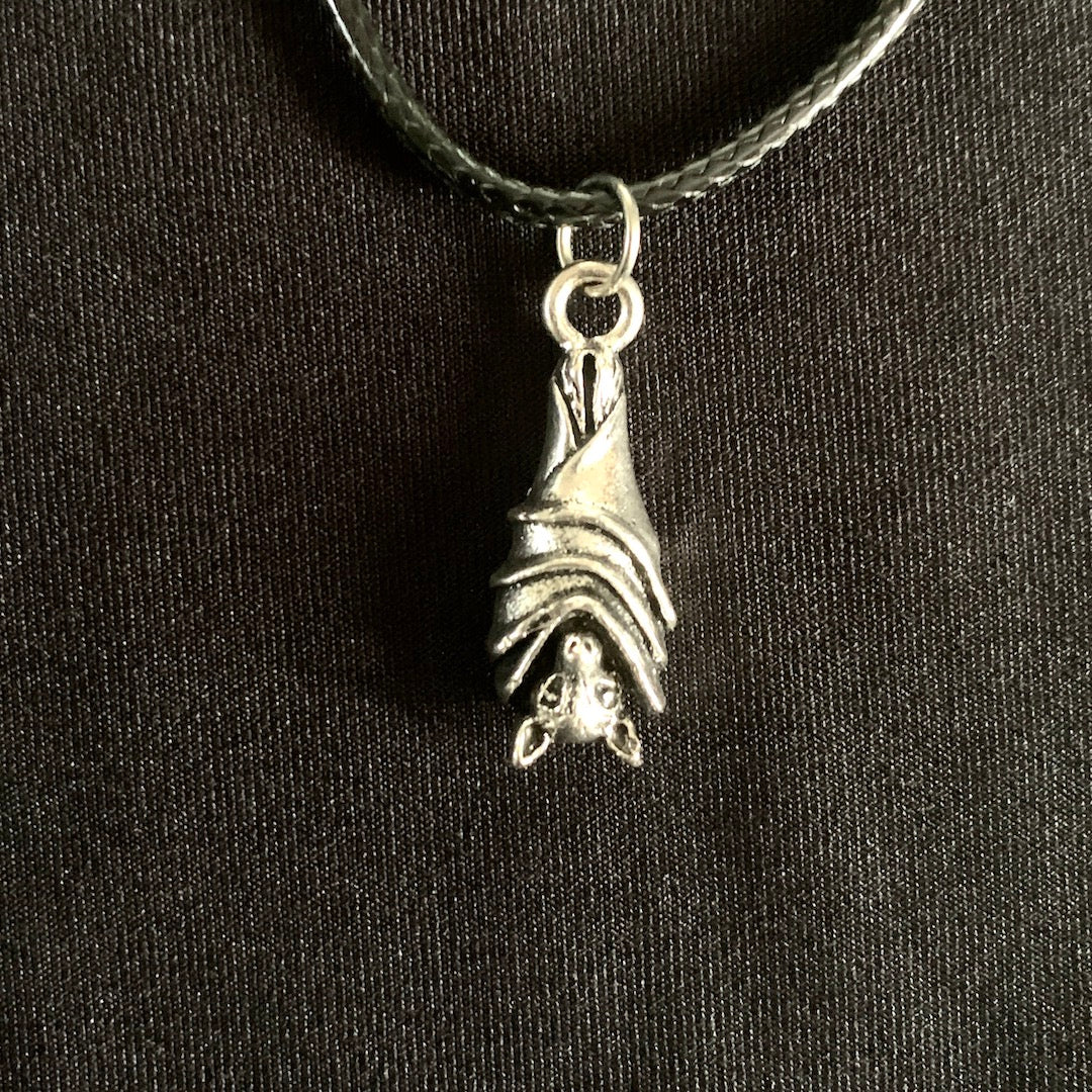 Your necklace features a highly-detailed hanging bat.  The drop measures about one inch in length.