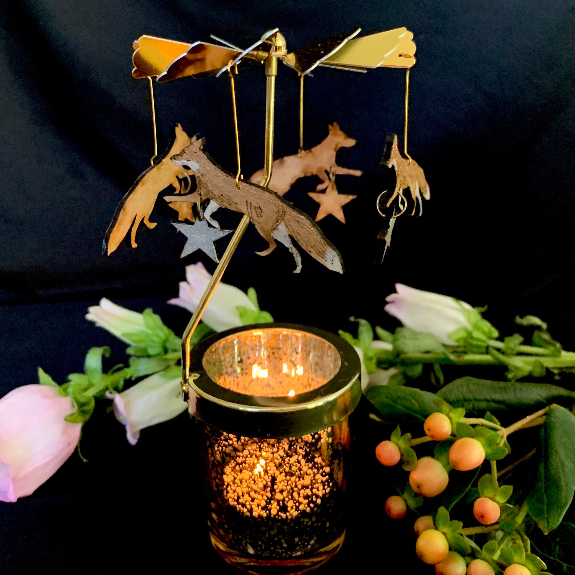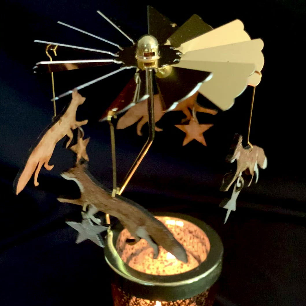 Four intricate Foxes and silvery stars adorn this whimsical carousel. Powered by a tea-light candle, the Foxes take flight, running through the starry evening. This simple mechanism evokes feelings of wonder and nostalgia. It's a breathtaking gift for anyone who craves a little magic.