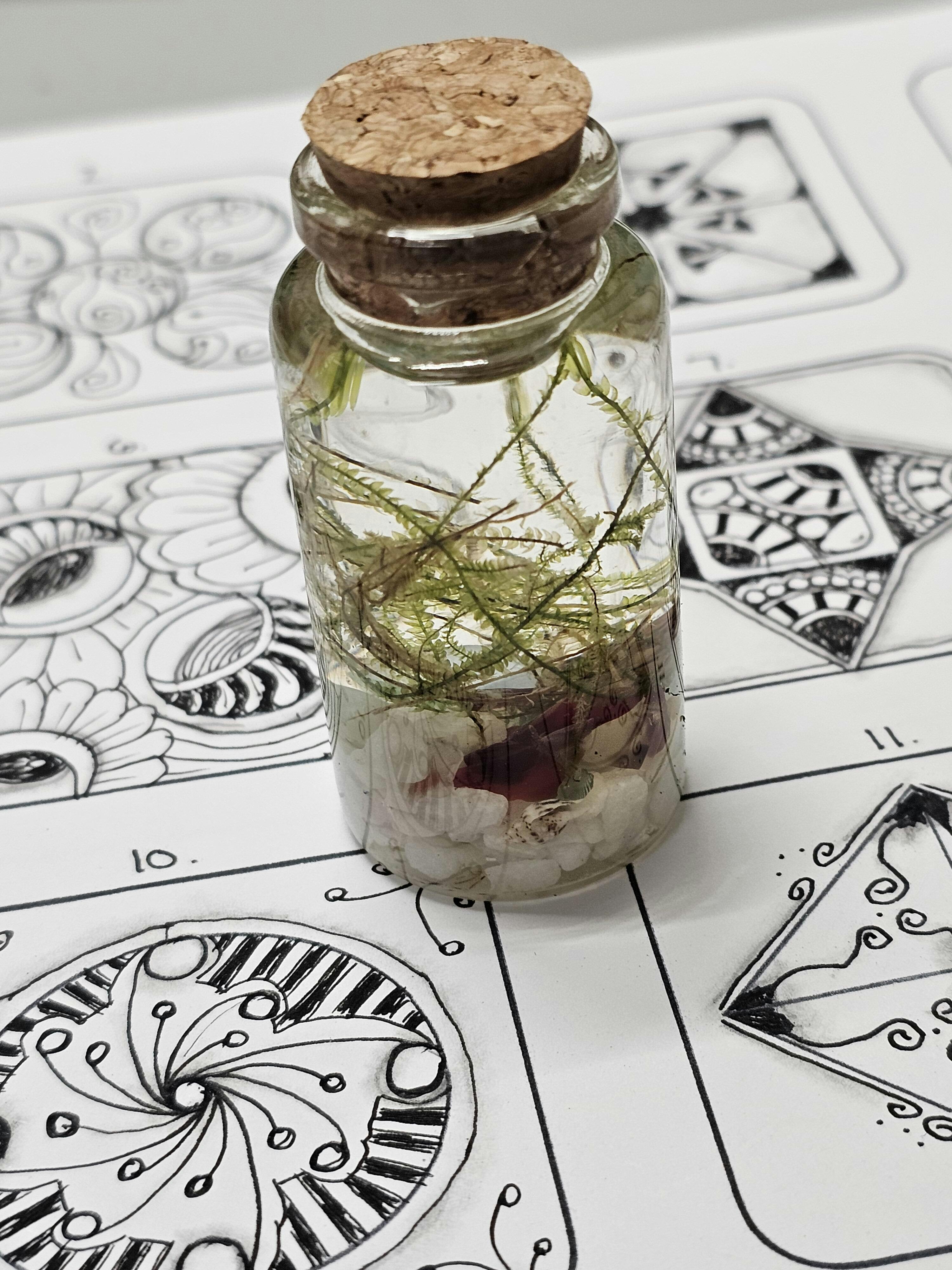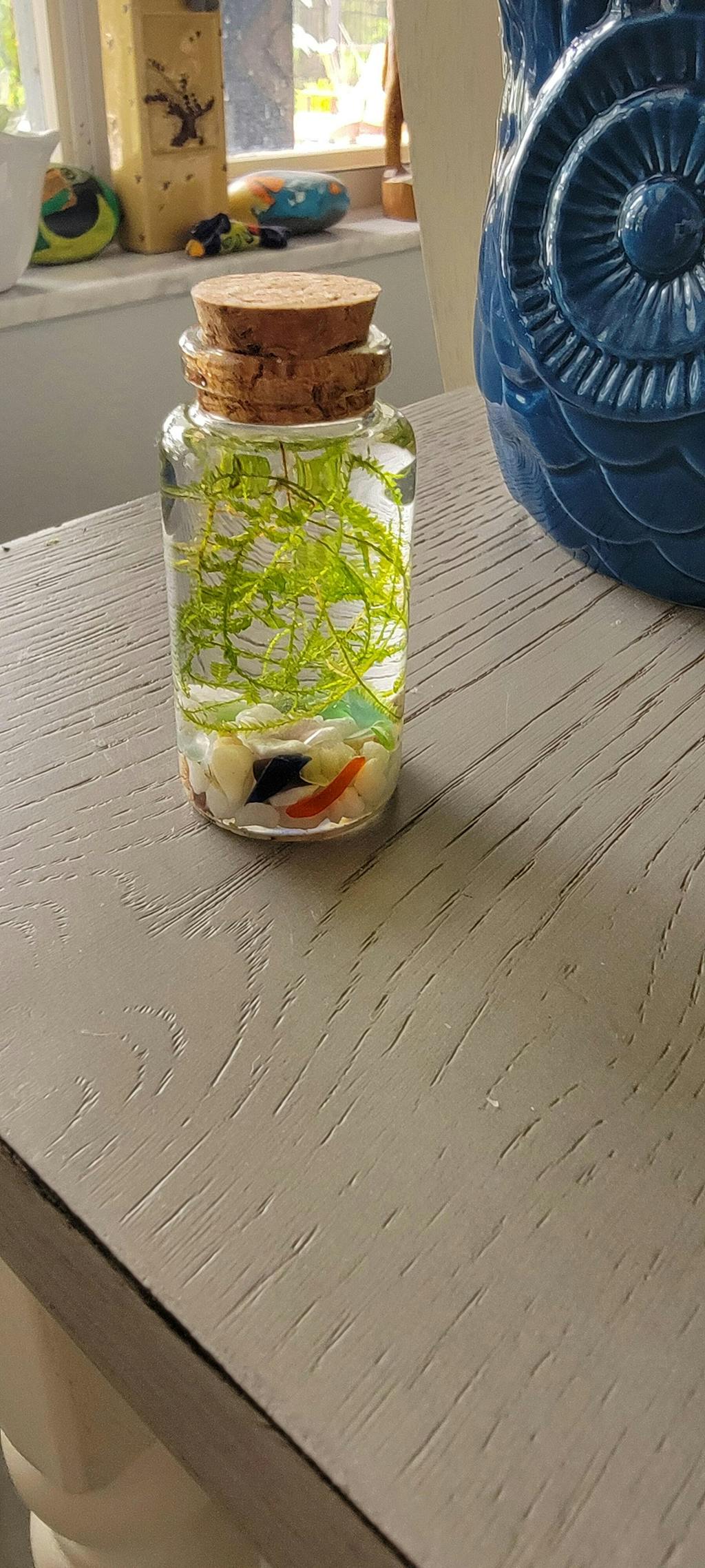 Rinse pebbles, shells, and glass before adding them to the jar. Add your chosen decorations to the jar and then fill with spring water or dechlorinated water. Trim away any soft black bits from your java moss. Use the included stick tool to arrange all components within your jar.
