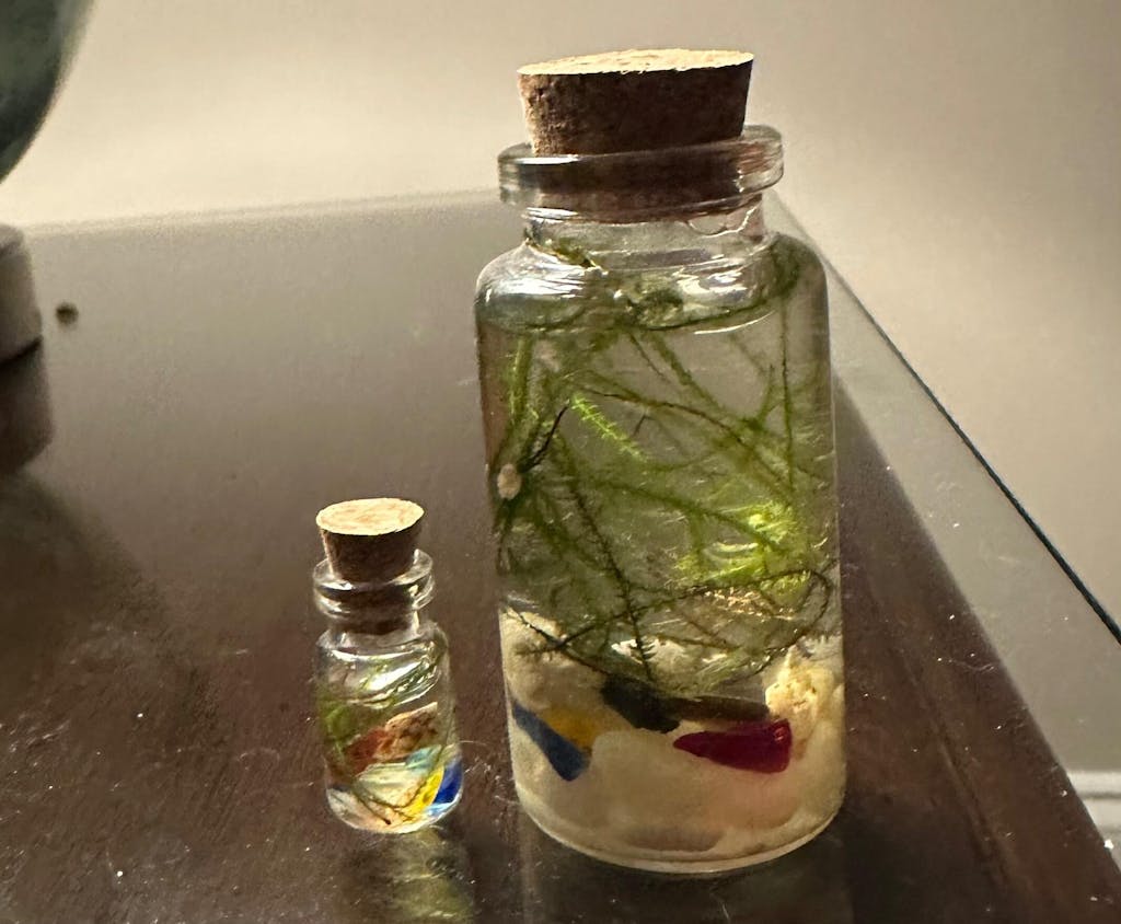 In some spots, the Lake resembles a glass paperweight. Its underwater flora is temporarily still. The Elder Turtle gives you a small sample of the Lake's moss and supplies for its habitat so that you can examine it more closely. Rinse the stones before adding them to the vial and provide the moss with dechlorinated or spring water.