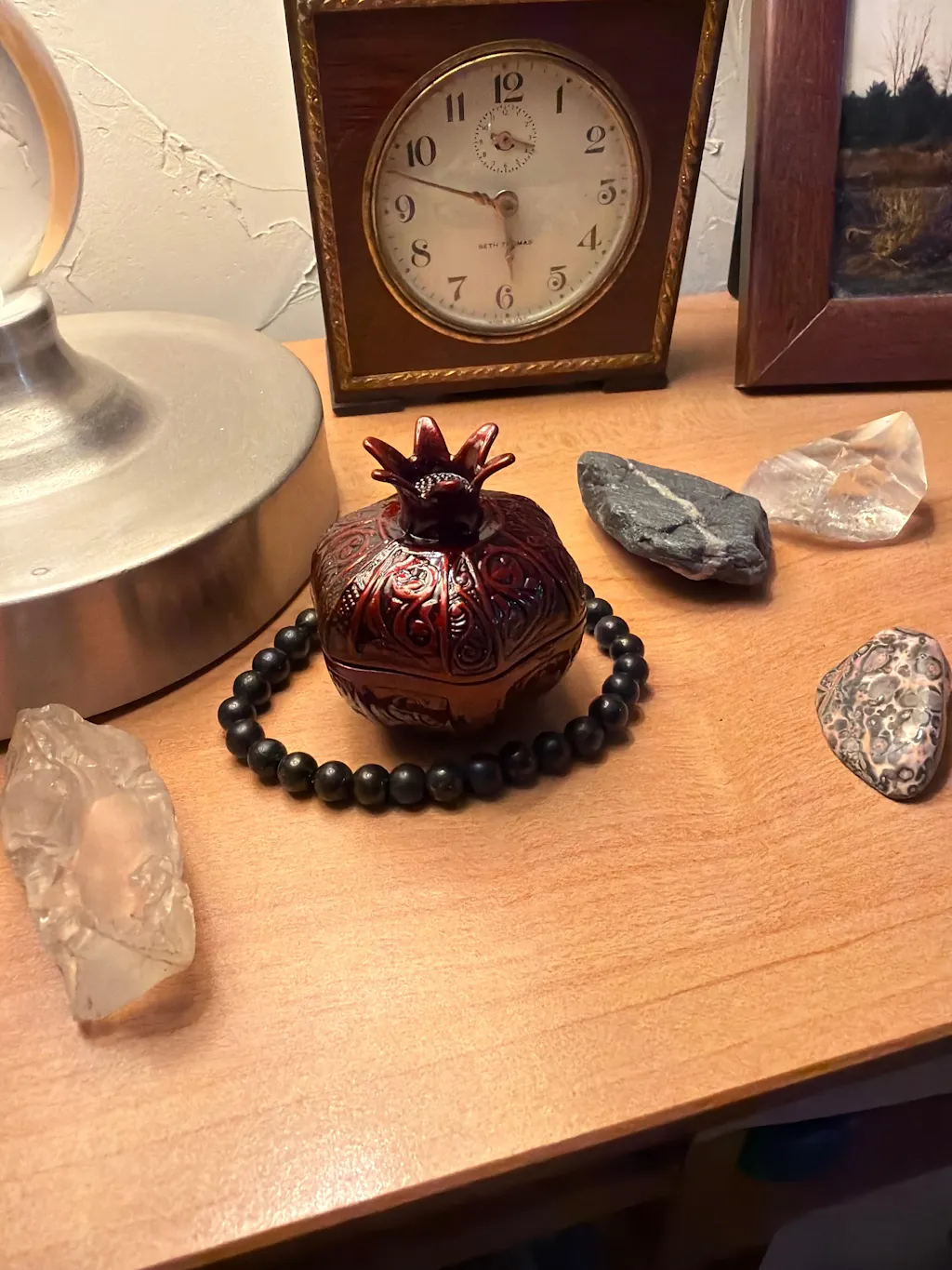 Your pomegranate-shaped box measures about 1.6x2 inches. It's made of a zinc alloy and finished with a burgundy glaze.