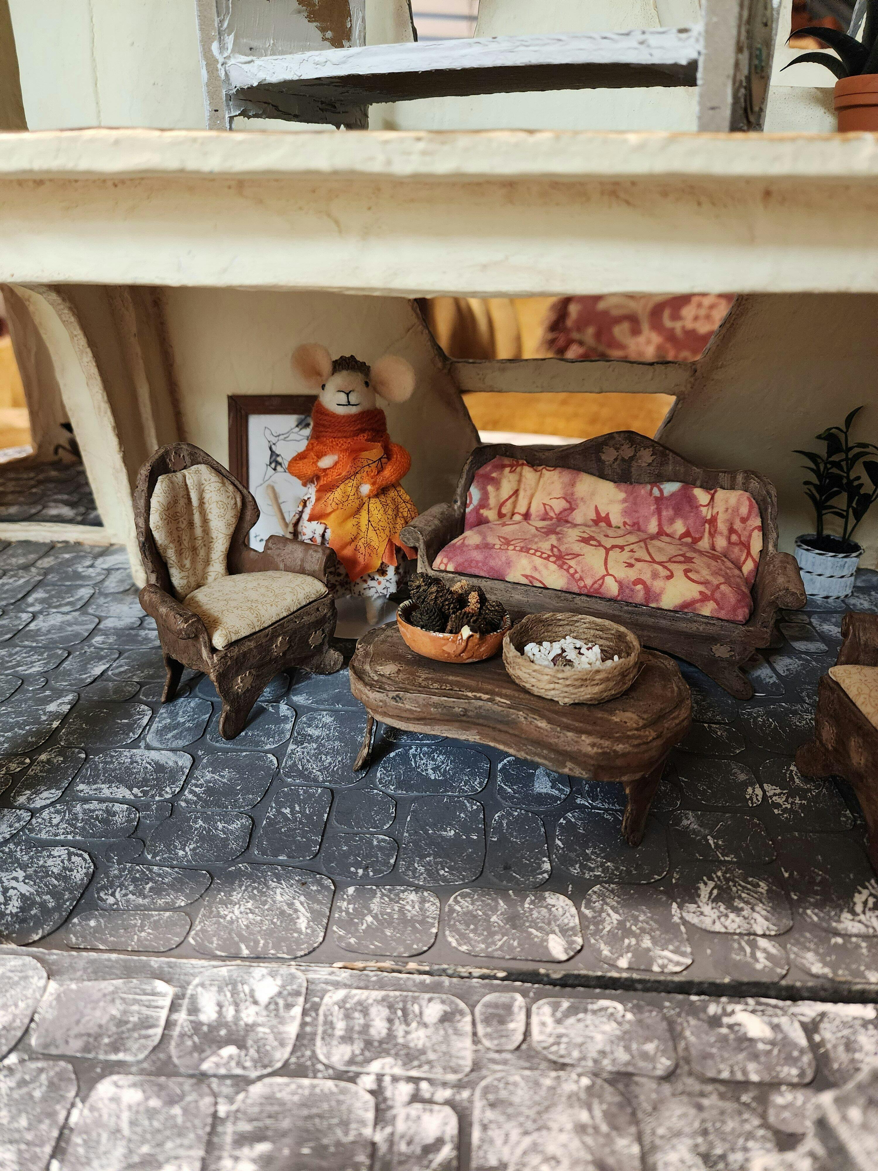 Handmade from soft, fluffy wool, each felted mouse is unique. This one wears an printed skirt and an acorn hat. She is accompanied by a faux leaf. Standing about 4.25 inches tall, she would be at home in most 1:12 scale dollhouses. Her tail can be gently posed to help her stand on a flat surface. She will arrive with a hanging loop so that she can be used as an ornament, but the loop can easily be snipped away.