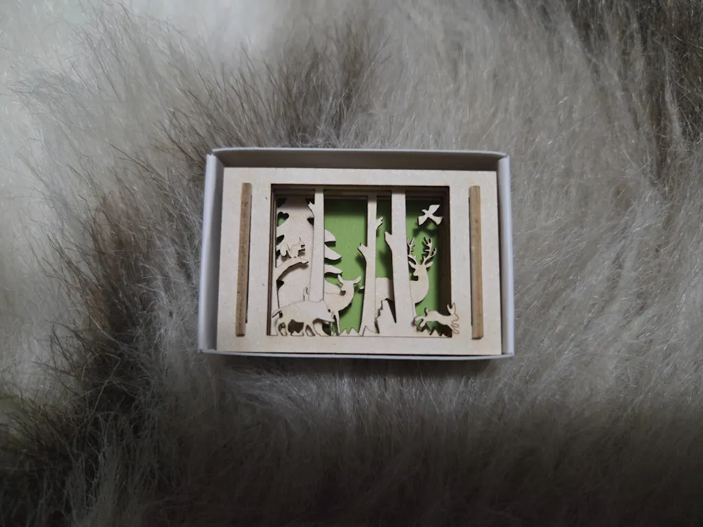 This tiny wooden scene includes 4 laser-cut layers to create a dimensional effect. Handmade in Germany.