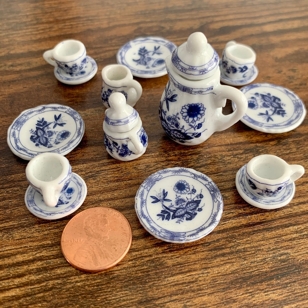 This 1/12 scale miniature tea service includes four tiny cups, saucers, and plates; plus a teapot, sugar bowl, and creamer. The teapot and sugar bowl have removable lids. It's made of white china with blue flower detailing.