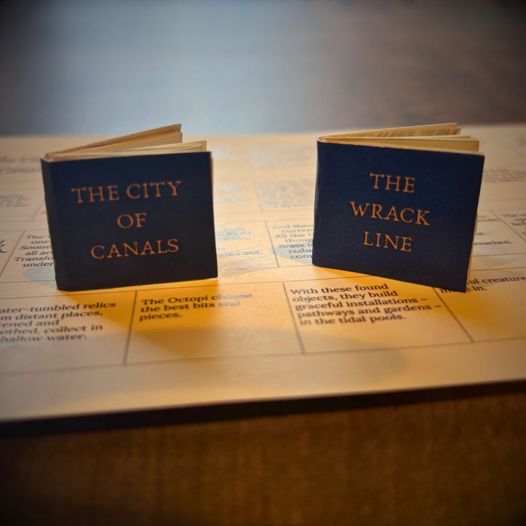 Reading also brings pleasure during the long winter nights. You find the tiniest of books, with the most miniscule type, lined up on a shelf. You pull out two and flip through them: one tells of the Far Shore and its wrack line; the other of Pont Lacuna and its Black Cat.
