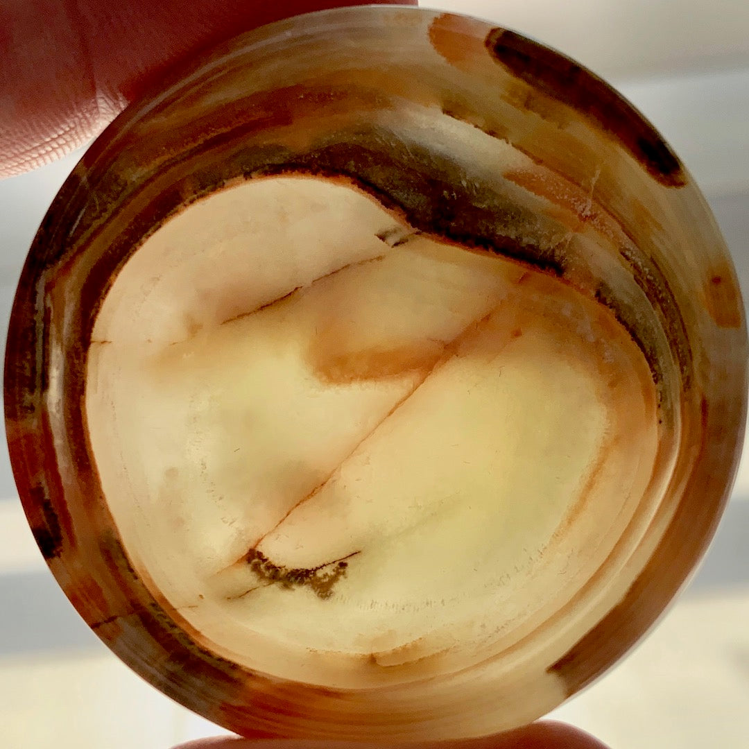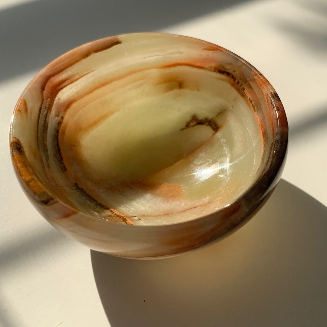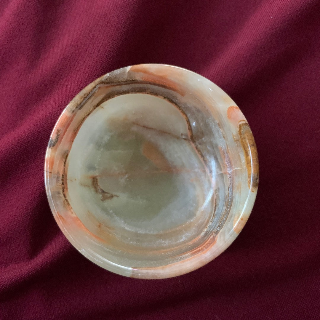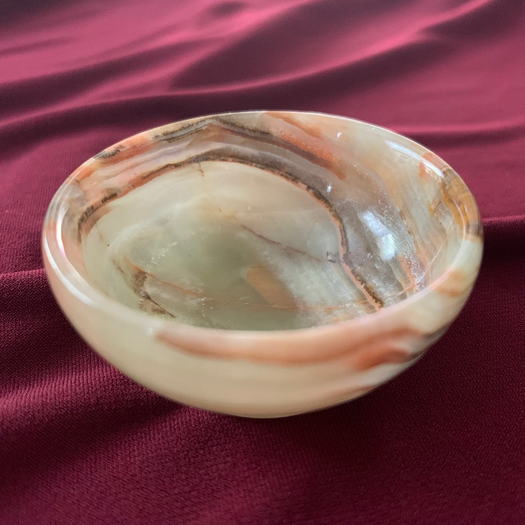 Your handmade green onyx bowl is about 2" in diameter. Each is unique, with different marble-like patterns and swirls of colors which may include cream, green, and brown. The onyx used to create these bowls was sourced from mines utilizing sustainable practices in Quetta and Peshawar, Pakistan.