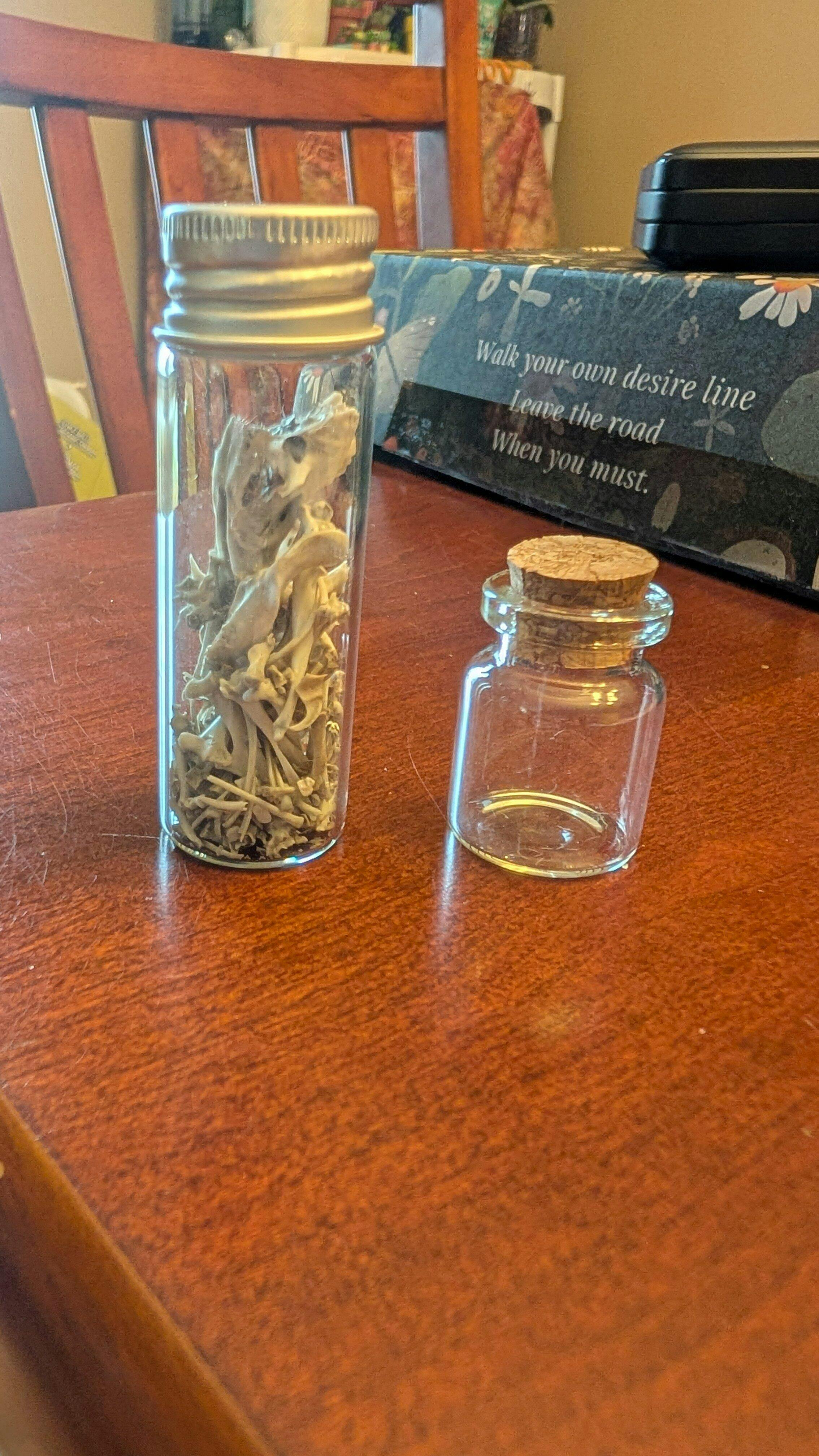 You receive a kit which includes a large Owl pellet, tweezers, brush, and a glass jar to display your finds. Your pellet contains dozens of tiny bones from creatures such as mice and shrews. The photo shows a partially-dissected pellet and all the bones we found inside.