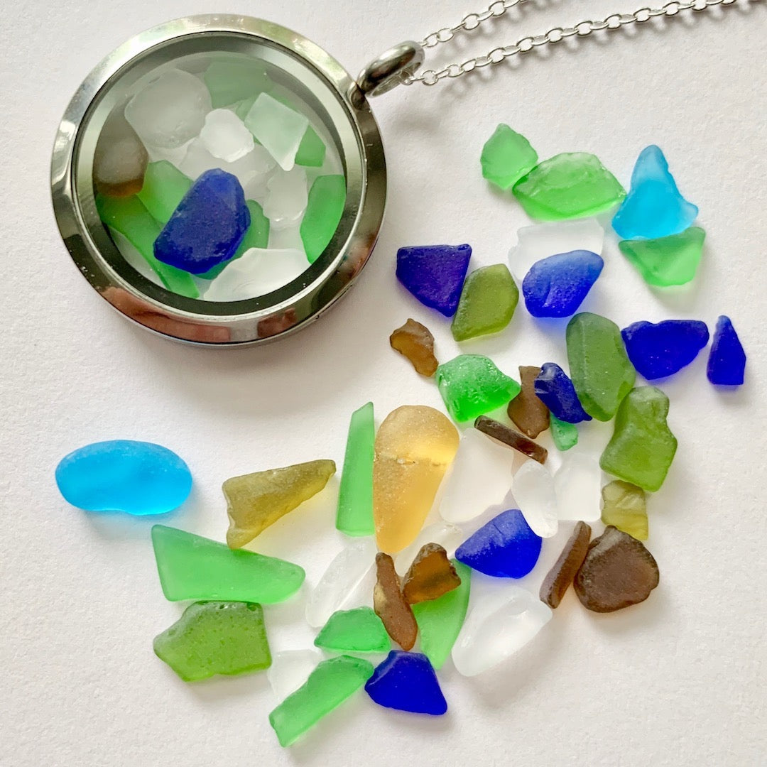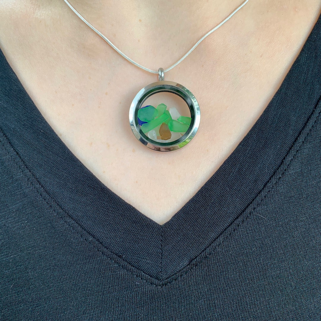 This porthole-style glass floating locket invites your creativity. It comes with a small collection of sea glass fragments you can use to fill it; or, you can quicken it with your own tiny keepsakes. Hang it in a window as a suncatcher or wear it around your neck. The locket is made of stainless steel 316L and features a strong magnetic closure. The included snake-style necklace is made of 925 silver-plated copper and measures about 22 inches.