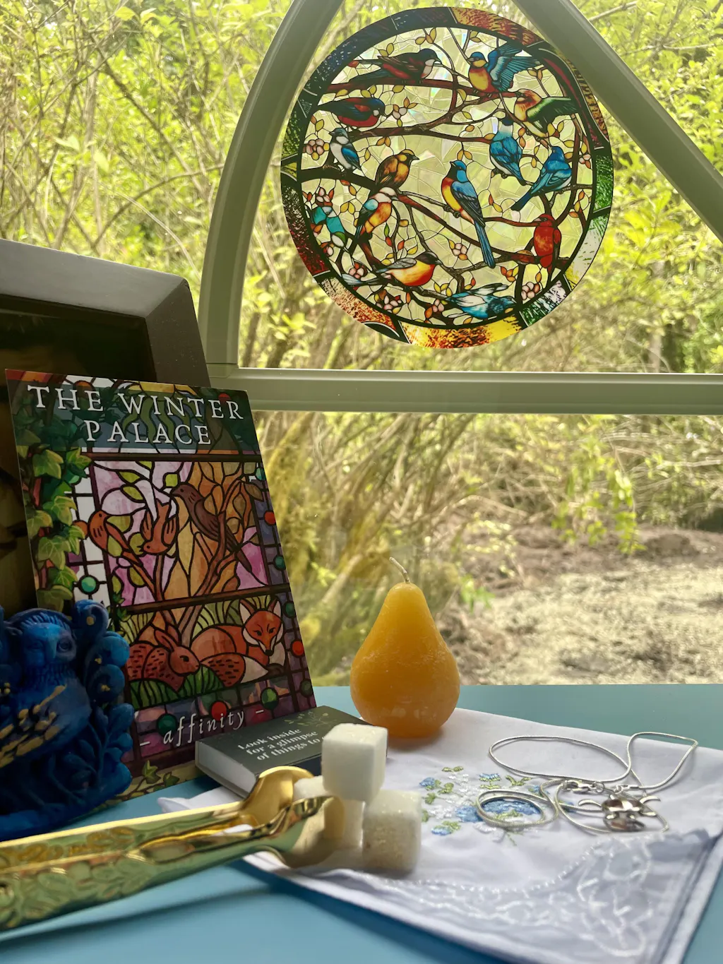 - After you enter the Palace’s immense doorway, it takes a moment for your eyes to adjust. In contrast to the white and gray landscape outside, the anteroom is rich with colors: deep browns and reds, exquisite blues and yellows. The facets embedded in the stained-glass windows scatter rainbows across the floor and walls. You hear birdsong and wonder if the birds depicted in the windows are magicked to sing; then you realize that the timbered ceiling is filled with real, fluttering birds, representing many Houses.