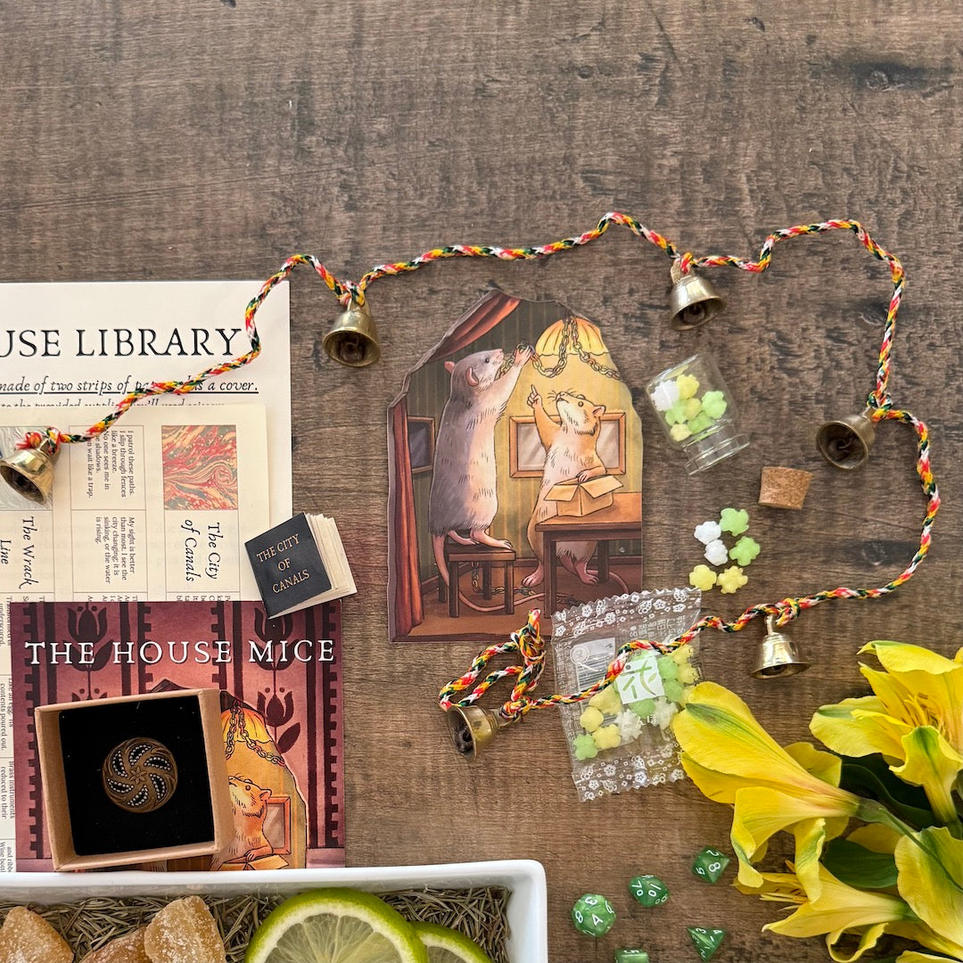 The House Mice have festooned the parlor with paper garlands and strands of little chiming bells. Pulling you inside the room and showing you around, the Mice explain that the cascading sound of bells helps to keep the Current moving and fresh, even deep within the walls of a house closed up against the cold.